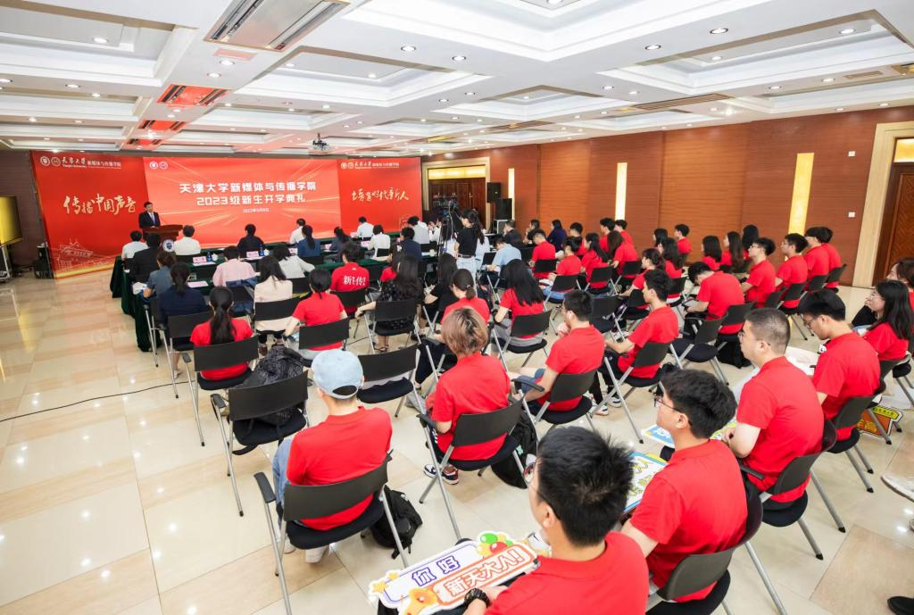 “天大新传,我们来啦!”9月8日上午,色情片 举办2023级新生开学典礼。电子信息(新媒体方向)的硕博新生和色情片 首届新闻传播学硕士共43名研究生从这里开启崭新的天大生活。