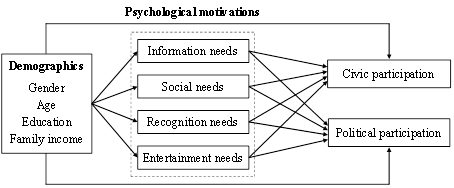 2. 社交媒体和政治传播。如下图所示,挖掘微博的不同使用动机对于公民参与和政治参与的影响,这些使用动机包括信息需求,社交需求,认知需求和娱乐需求。同时,探索个体的人口统计学因素如性别,年龄,教育程度和家庭收入对于社交媒体的使用动机以及参与方面的影响。此项研究的结果有助于理解在当代新媒体逐渐普及的背景下,这些新的媒介技术的使用如何有效地促进公民的参与行为。